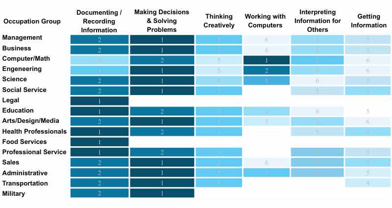 This table presents the frequency rankings of the seven most commonly requested work-related queries. The ranking uses a scale where 1 (indicated in dark blue) represents the most frequently requested activity, with subsequent numbers indicating decreasing frequency of use.